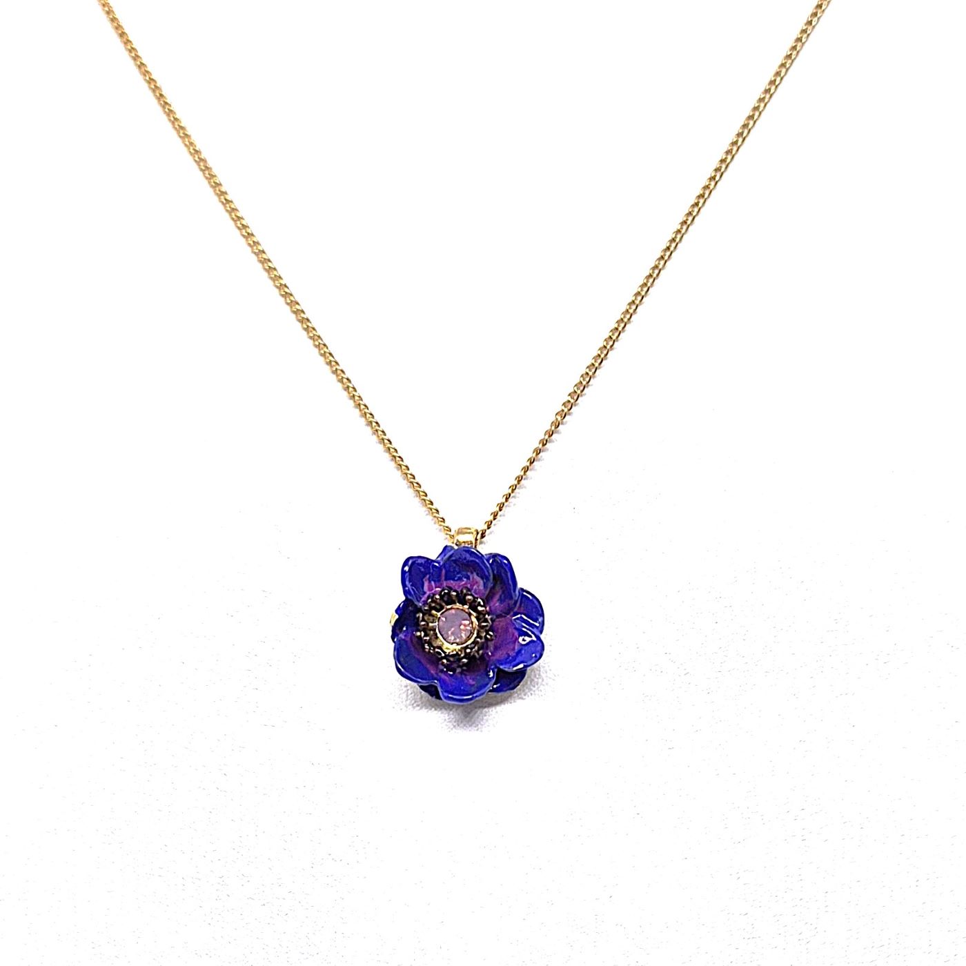 Chaine fine en laiton doré, avec un pendentif en forme de fleur. Il est délicatement travaillé, chaque détails ressortent avec le jeu des couleurs émaillées et le cristal en son centre. Collier discret dans les teintes de violet.
