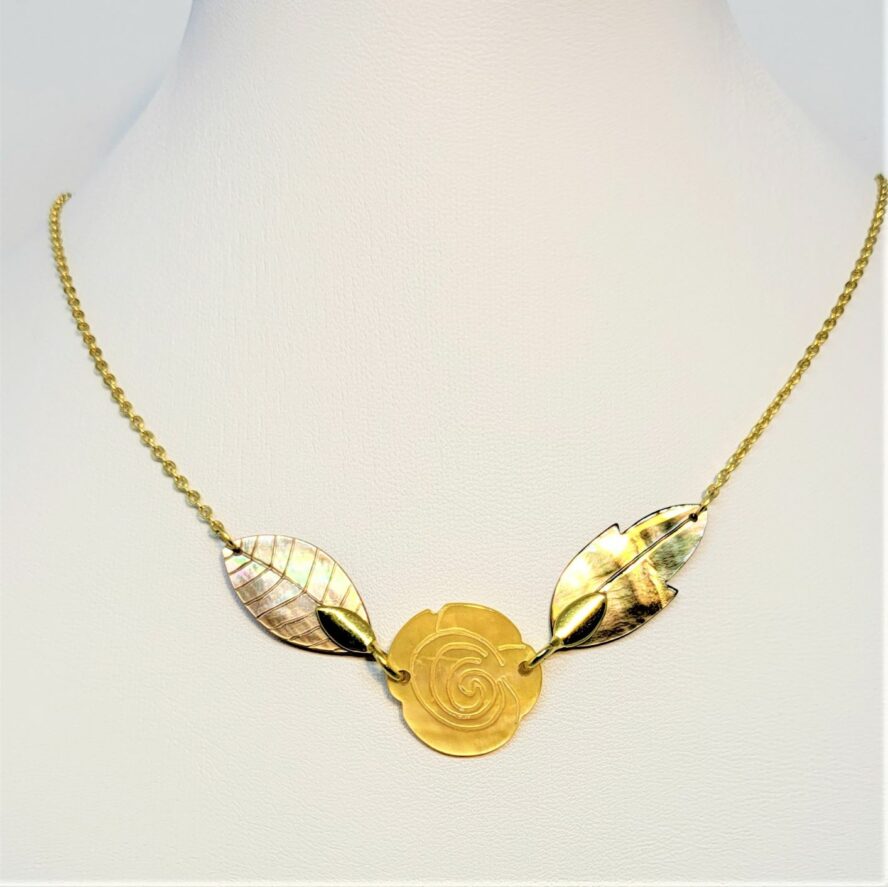 Collier  en bronze doré avec une chaine fine et ronde.  Deux éléments en forme de feuillage ‘2 cm sur 1 cm)   dans les teintes de nacre grise encadrent une fleur ( 2 cm)  en nacre jaune . Collier subtil , doux et précieux