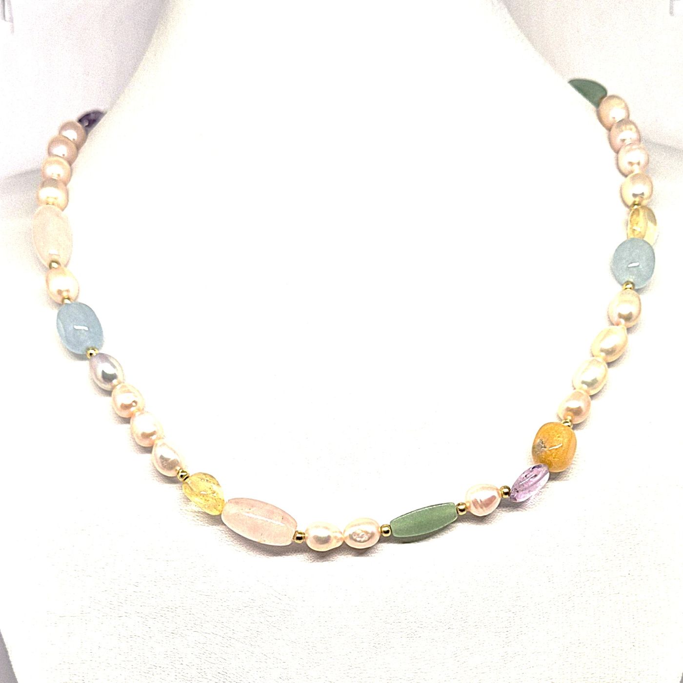Collier dans les teintes de rose pale par les perles d’eau douce , ponctué des couleurs douces grâce aux perles semi-précieuses. Le tout rehaussé par la présence de doré.