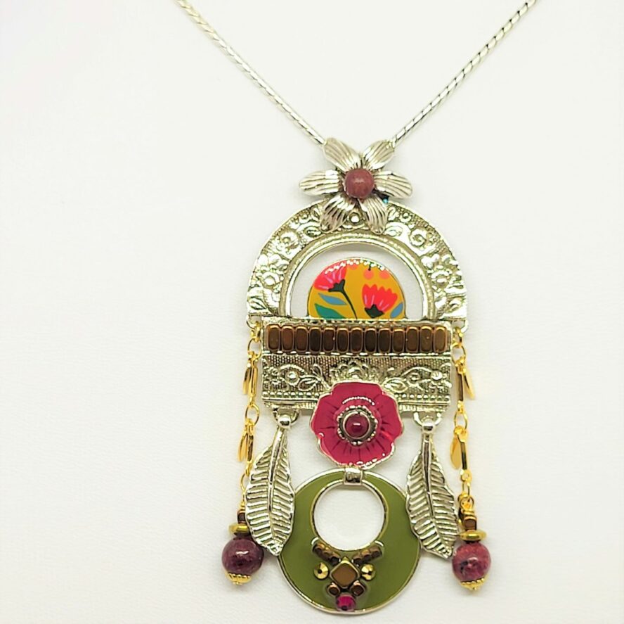 Collier en bronze argenté maille serpent . Le pendentif dans l’esprit bohème, avec la présence de pampilles de strass et de motifs floraux . Le doux mélange de couleur des éléments peints à la main est rehaussé par les perles d’hématites.