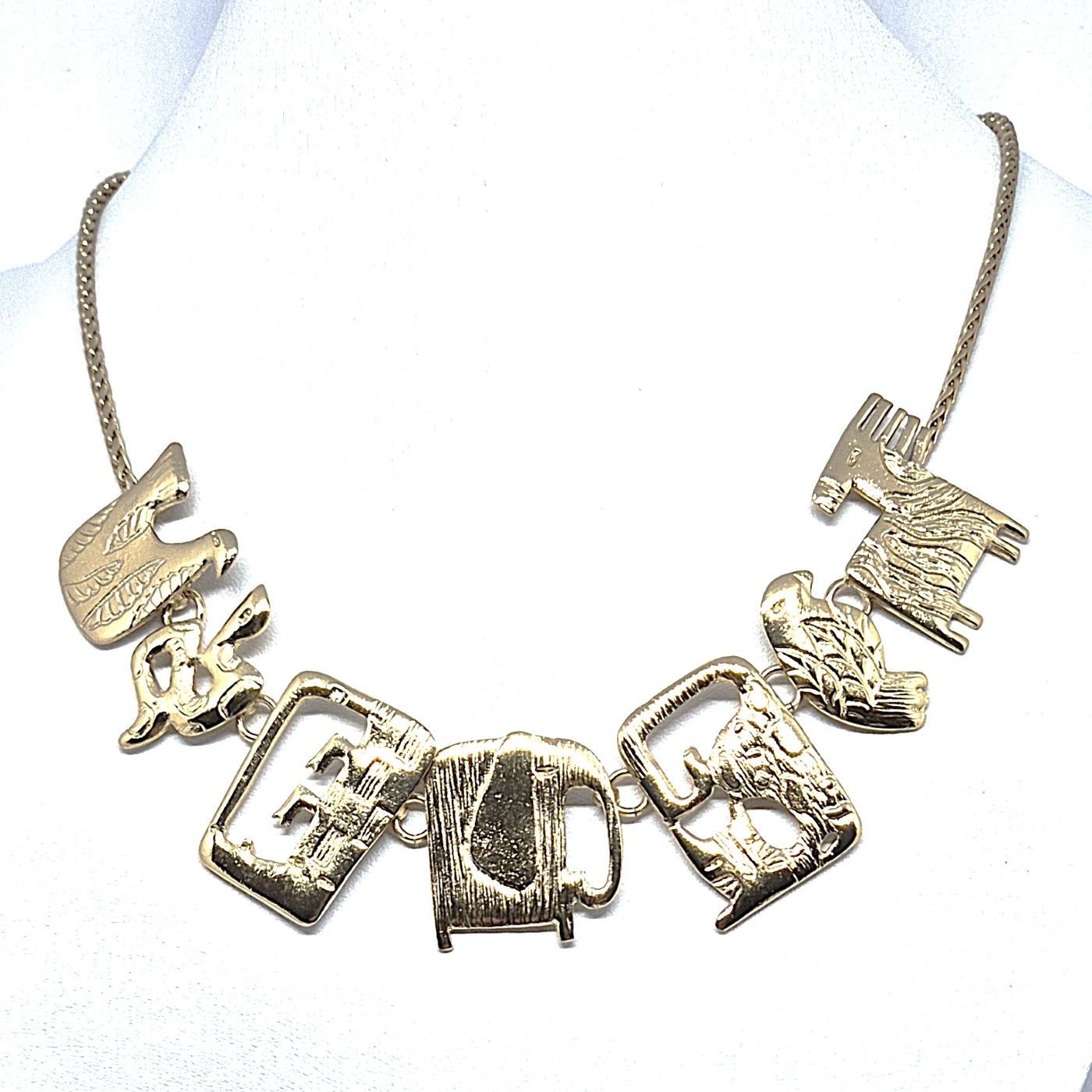 Collier en laiton doré avec une chaine tressée et ronde. Une suite de motifs articulés de représentation stylisées d’animaux, composent le collier. Collier qui s’adapte bien grâce à sa forme. Il est dans un style chic ethnique.