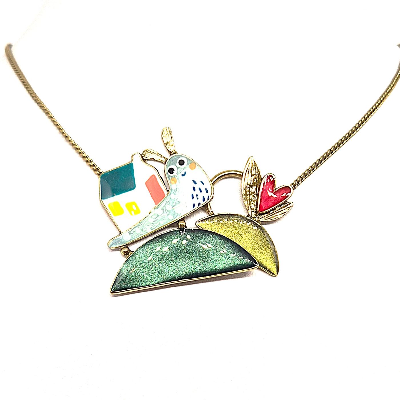 Collier en bronze, une maille plate met en évidence le pendentif . Le motif représente un escargot, il est peint à la main dans les couleurs douces . De la poudre de mica prise sous résine verte apporte une touche lumineuse. Collier court qui s’adapte bien car il est articuler.