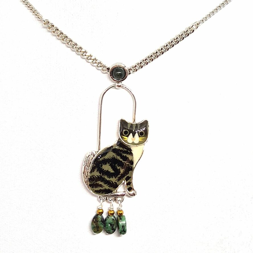 Collier en bronze argenté, une maille plate et fine met en valeur le pendentif. Le chat est peint à la main et est agrémenté de pampilles de turquoises