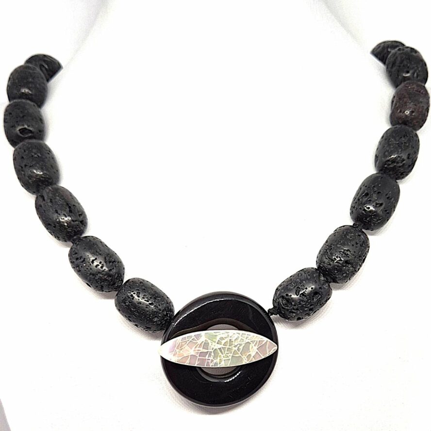 Collier composé de perles ovales de pierre de lave (2cm sur 1 cm), il est terminé par un fermoir rond ( 3.5 cm ) en corne noire et un bâtonnet ( 3.5 cm ) de mosaïque de nacre blanche. Collier moderne et chic .