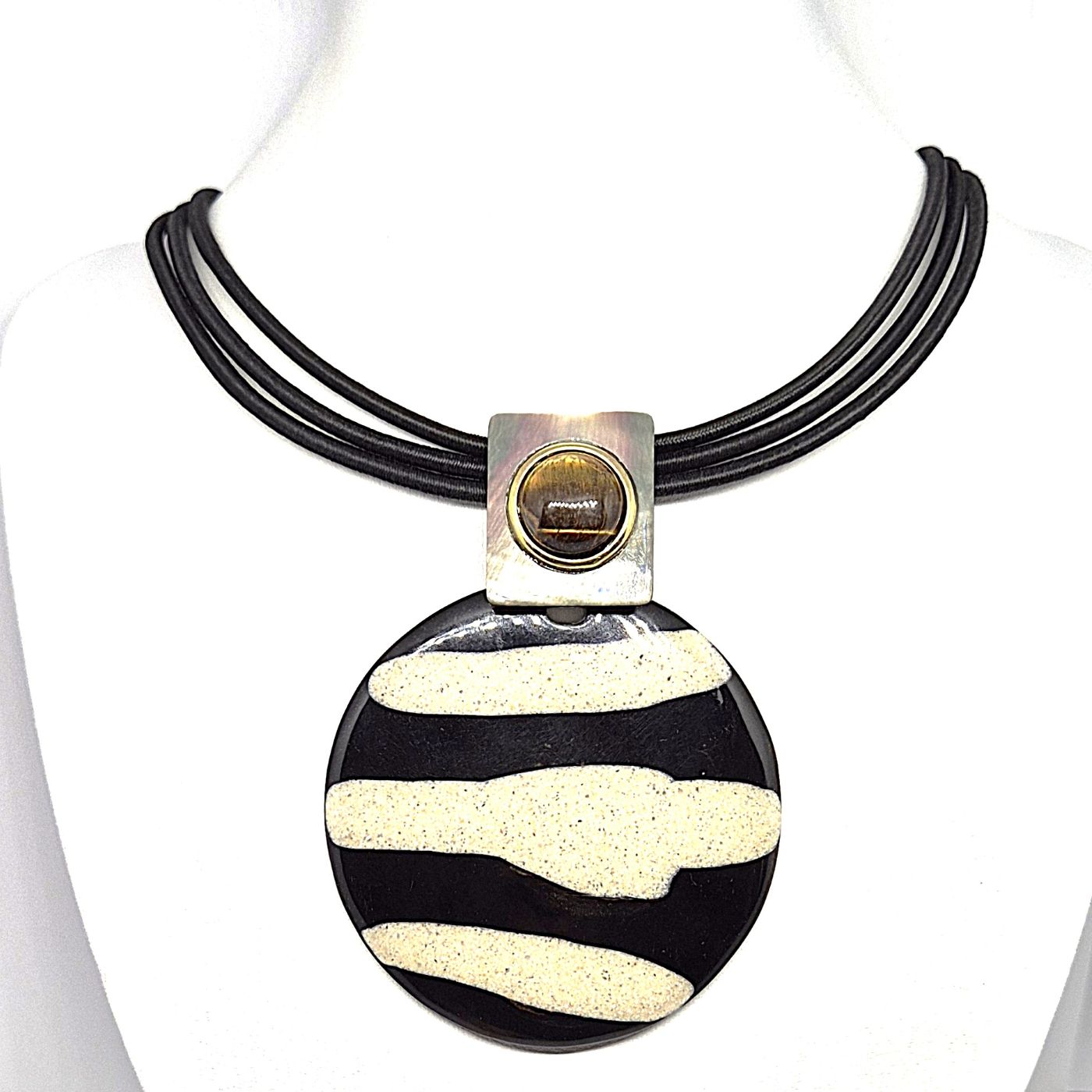 Collier en coton ciré qui met en avant le pendentif zébré de corne et de sable résiné. Il est surmonté par un élément de nacre grise dans laquelle est enchâssée un beau cabochon d’œil de tigre. Collier aux beaux volumes, très léger à porter et d’une beauté brute et raffinée.