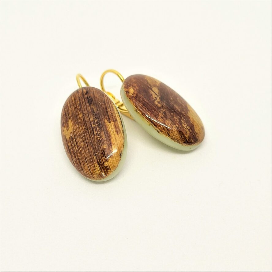 Dormeuses en bronze doré à l’or fin, un élément résiné blanc est surmonté de lamelle de bananier