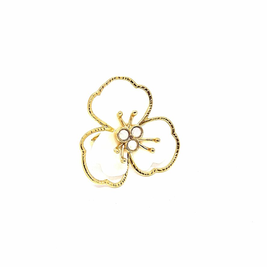 Bague réglable en bronze doré, avec une jolie fleur découpée, le cœur est constitué de pétales de nacre et de cristal.