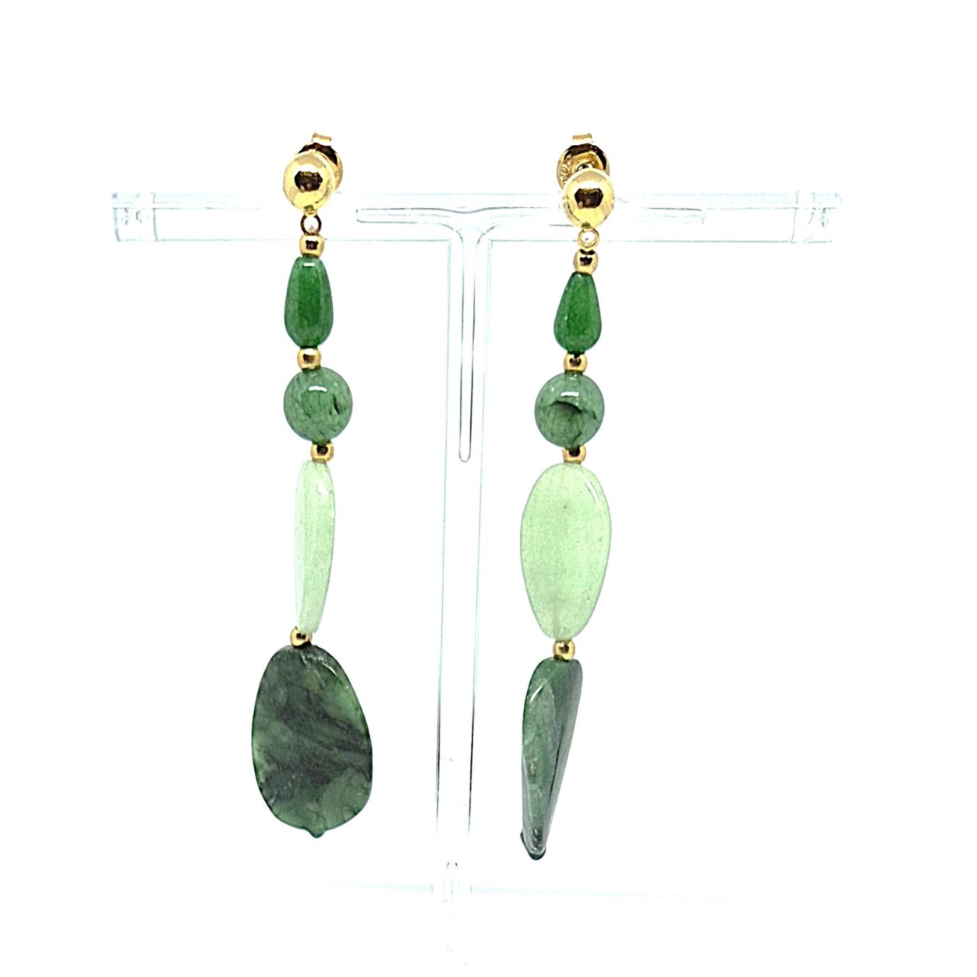 Boucles d’oreilles tiges droites, avec un dégradé de perles dans les camaïeux de vert. le jeu du travaille et de forme des perles est mise en valeur par une touche de doré. Boucles légères, avec un doux mouvement grâce à al forme des perles.
