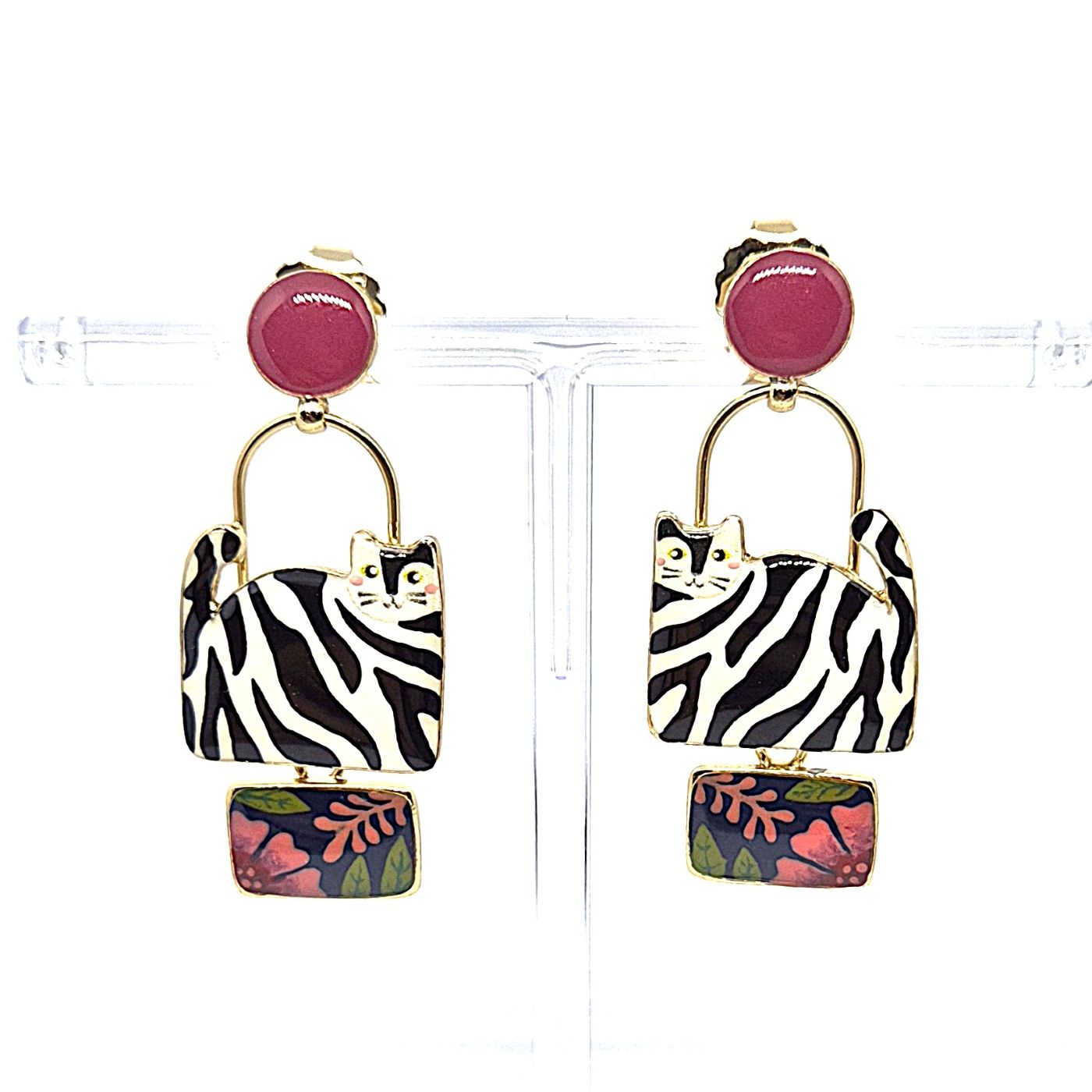Boucles tiges droites en laiton doré. L’élément principal représente Alfred, un gros matou dans les tons de noir et blanc. Tous les détails sont peints à la main. Boucles légères et articulées