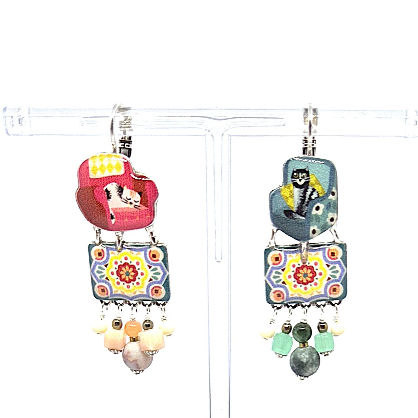 Dormeuses dépareillées en bronze argenté représentant des chats pelotonnés, tous les détails sont peints à la main. Les pampilles font penser aux franges des tapis. Boucles légères et faciles a porter.