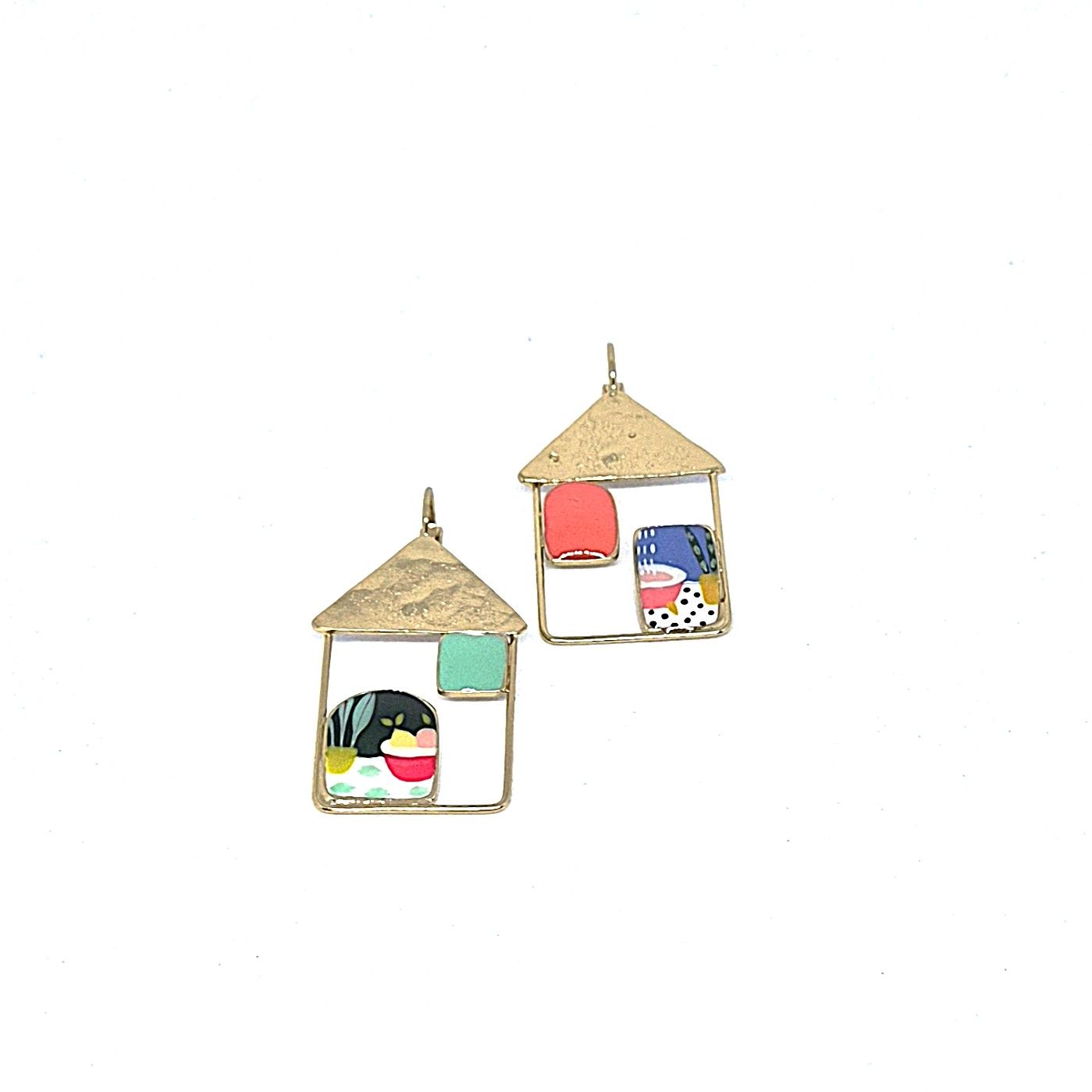 Dormeuses dépareillées en laiton doré représentant une maison, chaque fenêtres montrent des moments de vie. Les détails sont peints à la main dans des teintes douces. Un jeu de lumière est apporté par l’aspect froissé de la toiture. Boucles légères.