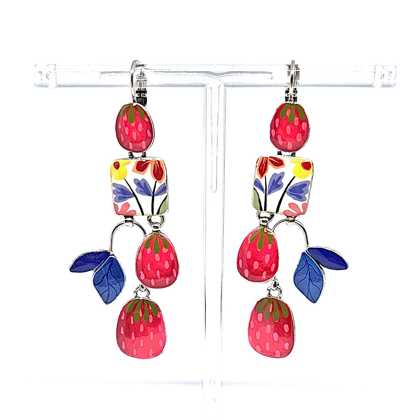 Dormeuses en bronze argenté. Les détails des fraises et des fleurs sont peints à la main. Boucles légères aux couleurs vives et contrastées.