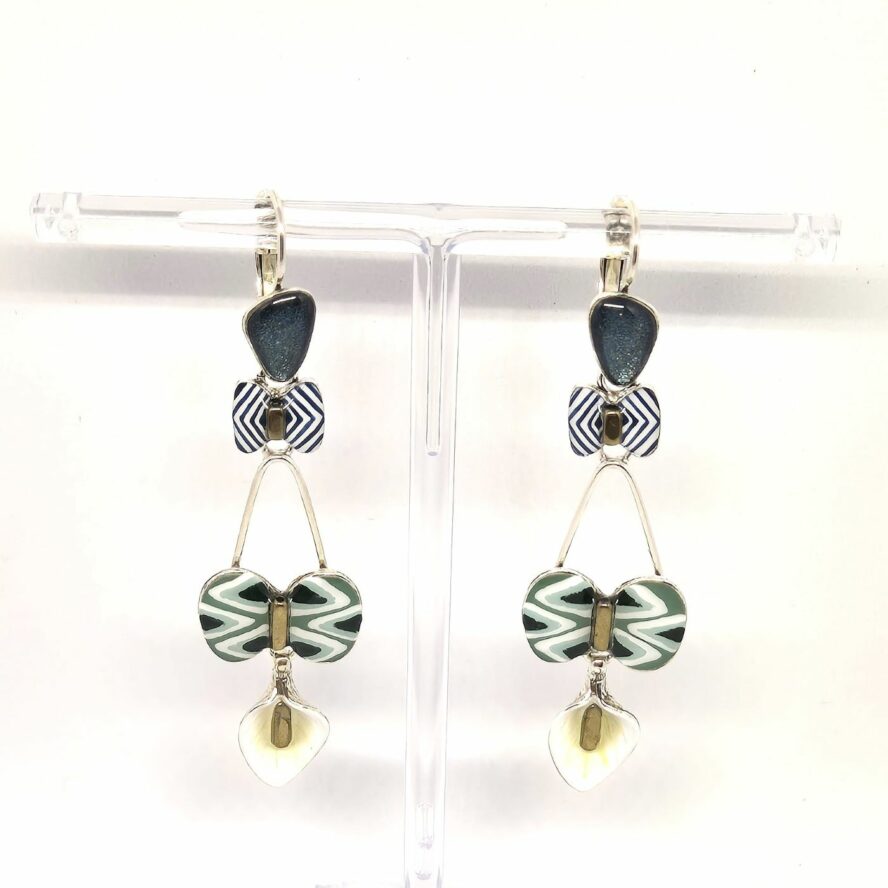 Dormeuses en bronze argenté. Les éléments sont peints à la main, certaines ont de la poudre de mica prise sous résine pour donner de l’éclat. Boucles raffinées et légère dans les camaïeux de bleus,