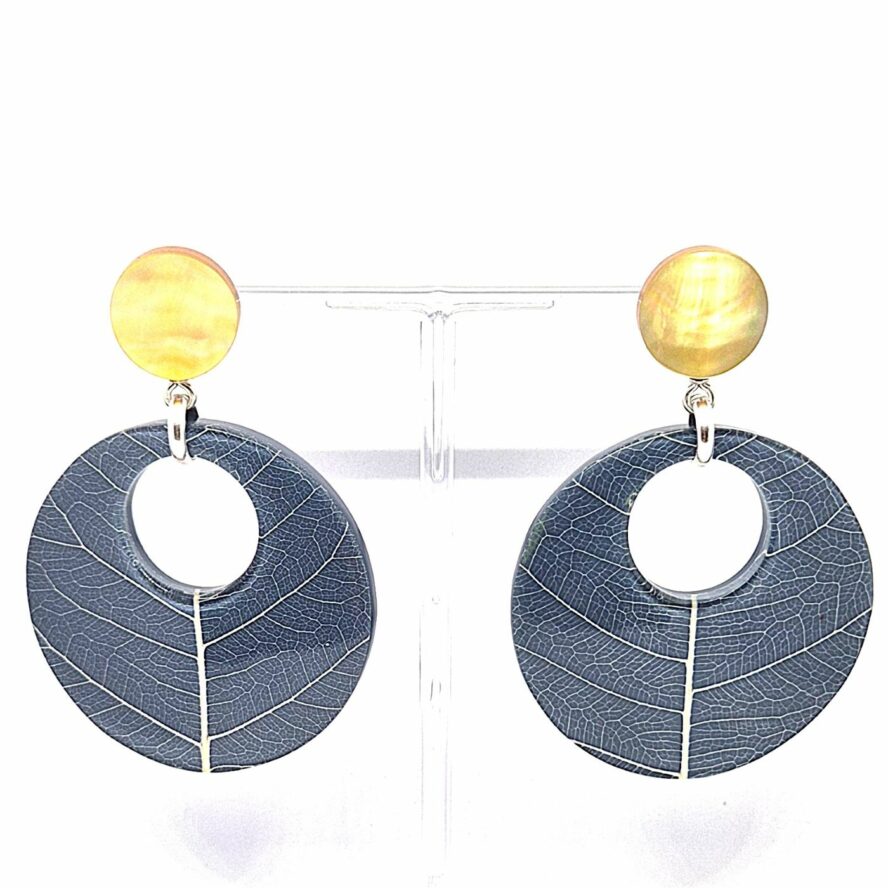 Boucles d’oreilles avec un bouton de nacre sur le lobe (1.5cm) , suivie d’un cercle composé d’une feuille de prise sous résine colorée. Boucles très légères.