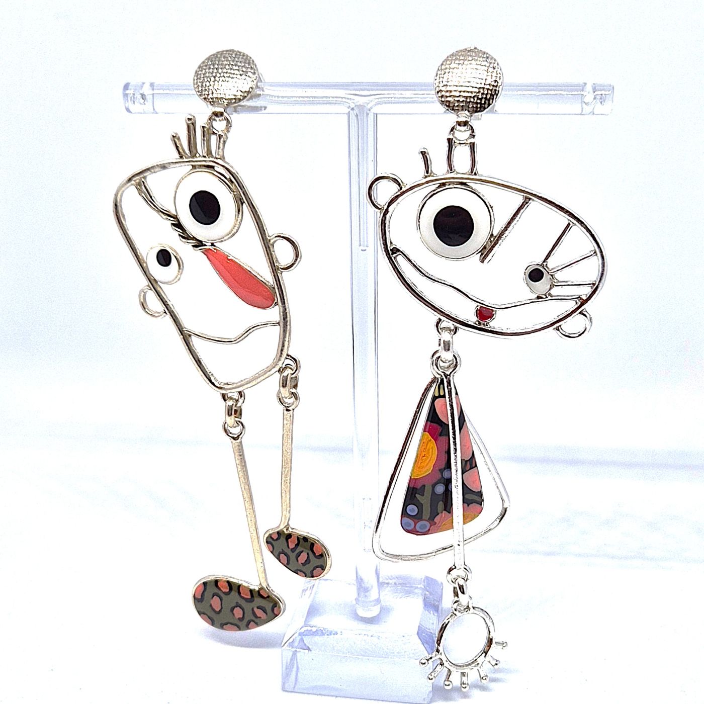 Boucles à tiges droites, dépareillées en bronze argenté. Les personnages sont comme des dessins d’enfants, avec quelques touches de couleurs ( peint à la main). Boucles légères et tout en mouvement.