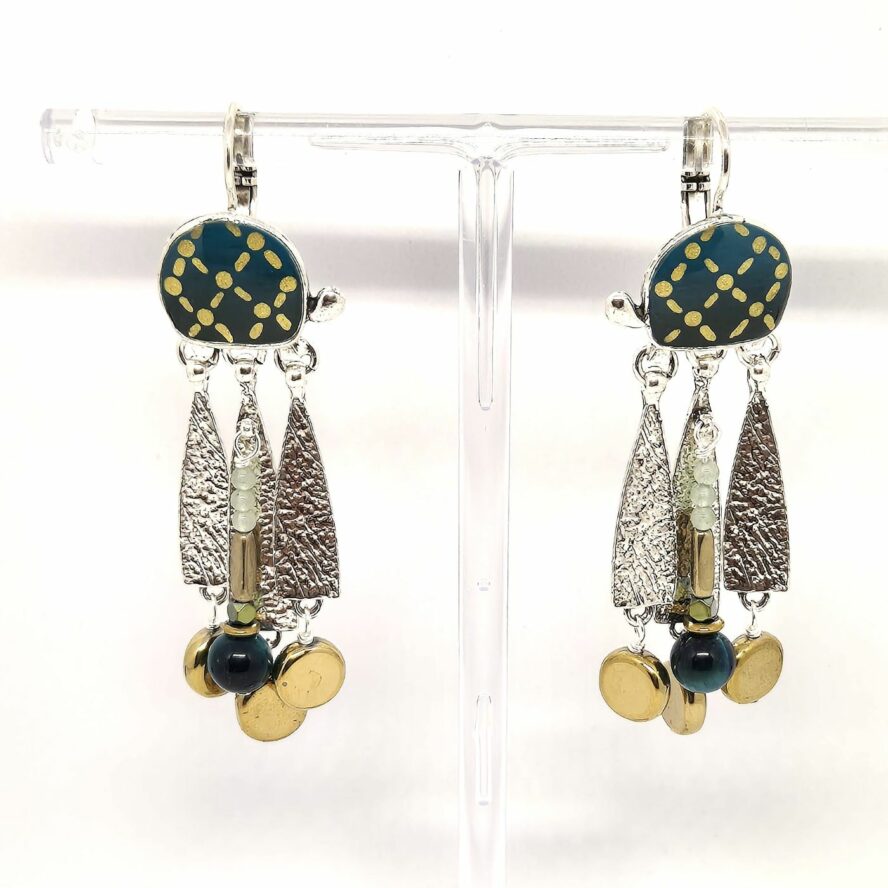 Dormeuses en bronze argenté représentant une tortue peinte à la main . De celle ci partent des pampilles de métal froissé avec des perles d’hématite, d’œil de tigre teinté. Boucles légères et lumineuses