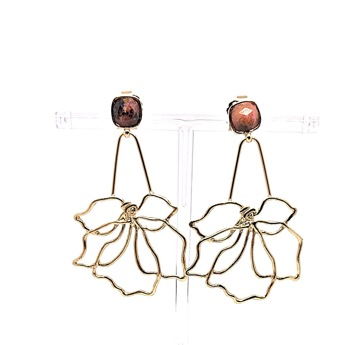 Boucles tiges droites en laiton doré. Les rubis indiens sur le lobe mettent en évidence les fleurs d’hibiscus délicatement ajouré. Boucles légères et mobiles.