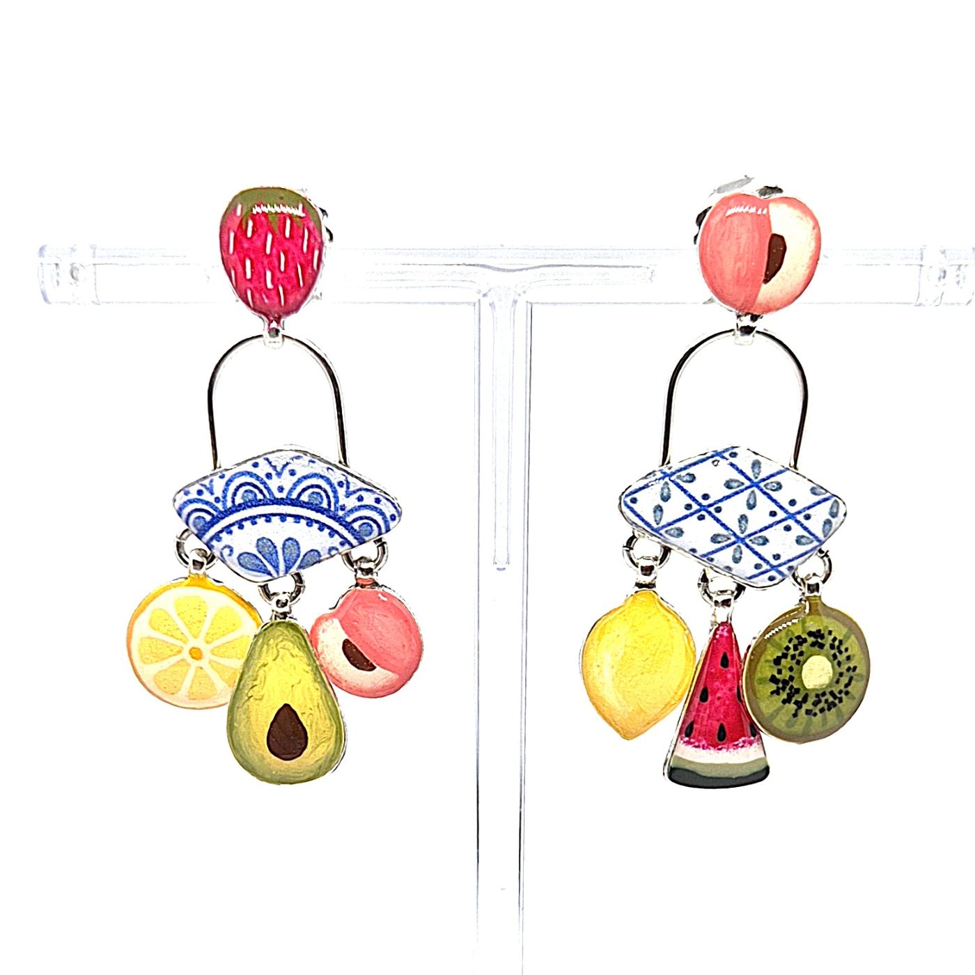 Boucles dépareillées tiges droites en bronze argenté. Une multitude de fruits y sont représentés, donnant l’image d’une belle salade de fruits. Tous les éléments sont peints à la main. Boucles légères et colorées.