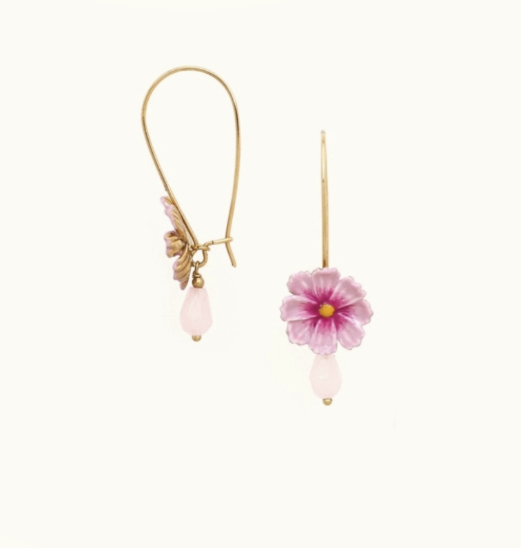 Boucles crochets en bronze doré , la fleur émaillée dans les tons de rose est marquée apr la présence de la pampille en quartz rose. Boucles légères et délicates