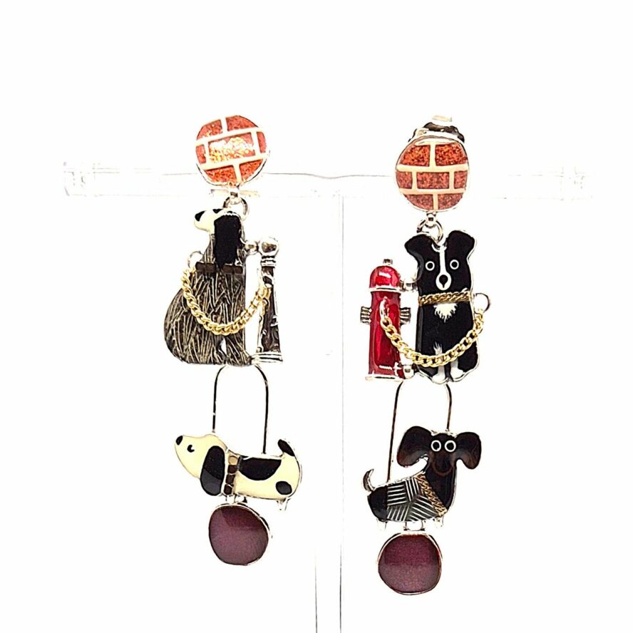 Boucles d’oreilles dépareillées tiges droites en bronze argenté. Les petits chiens sont peints à la main. De la poudre de mica prise sous résine est présente pour apporter du relief et de la lumière.