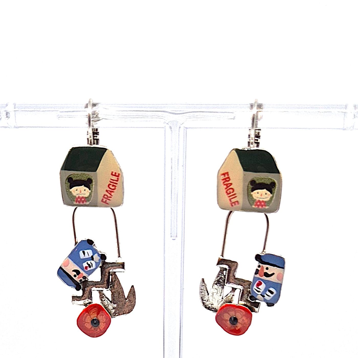 Dormeuses en bronze argenté, nous rappelant une comptine de notre enfance. Tous les éléments sont peints à la main. Boucles légères et mobiles