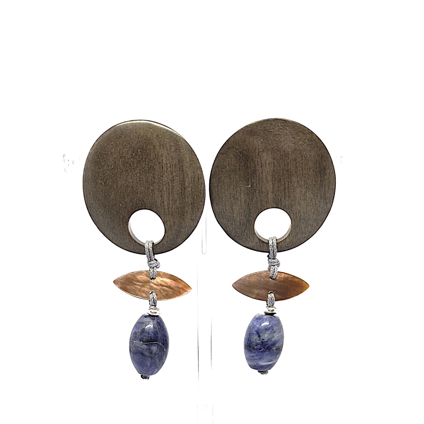Boucles d’oreilles avec un disque d’ébène au niveau du lobe. Suivie d’un élément en nacre pour faire un jeu de contraste avec l’ébène. La boucle se termine par une sodalite pour donner de la matière. Boucles légères et d’une élégance verticale.
