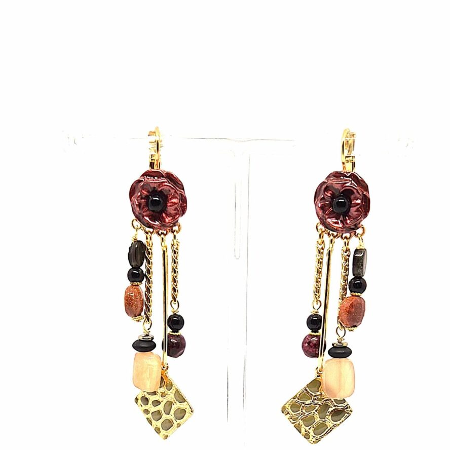 Dormeuses en bronze doré à l’or fin. La fleur est peinte à la main dans les tons de vieux rose , elle est accompagnée de petites pampilles en pierres ( quartz rose, pierre du soleil, jaspe). Boucles faciles a porter avec ses couleurs douces mais lumineuses.