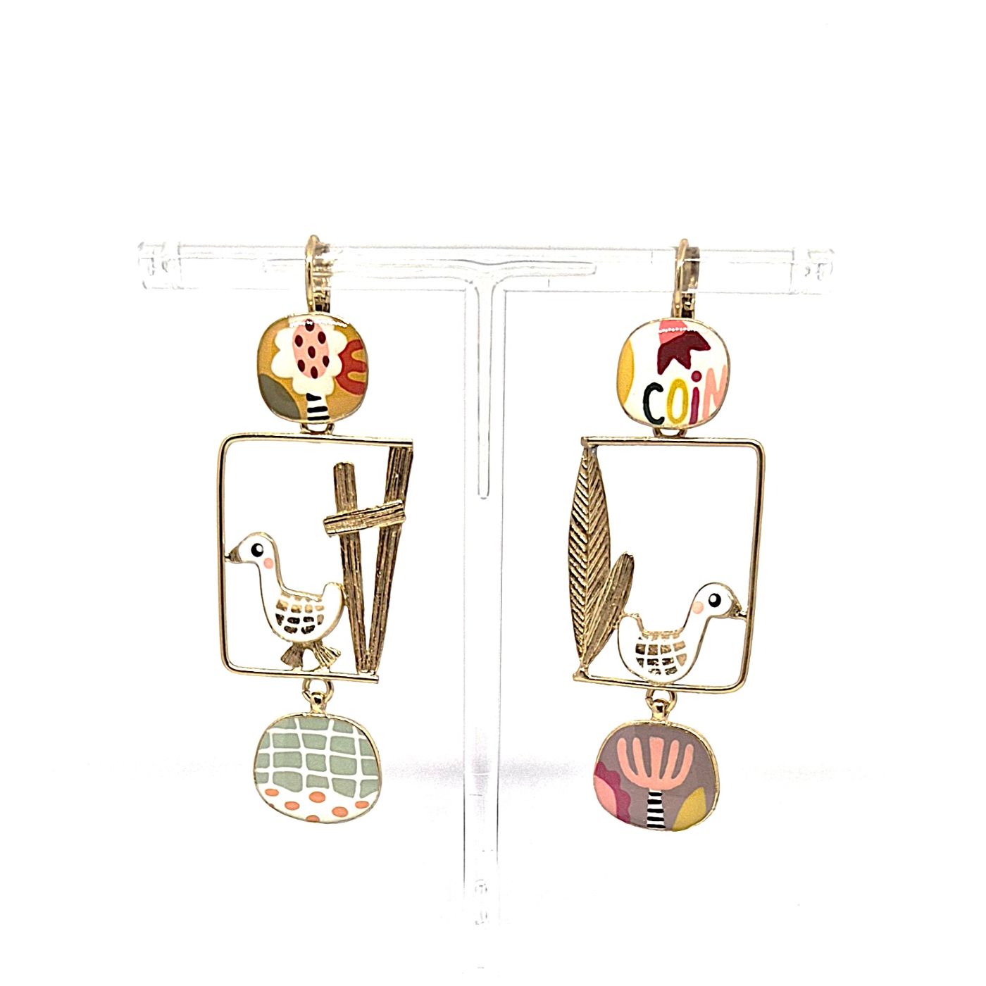 Dormeuses dépareillées en laiton doré. Les éléments délicatement découpés représentant des oies, sont peints à la main dans des tons doux. Boucles légères, mobiles et faciles a assortir.