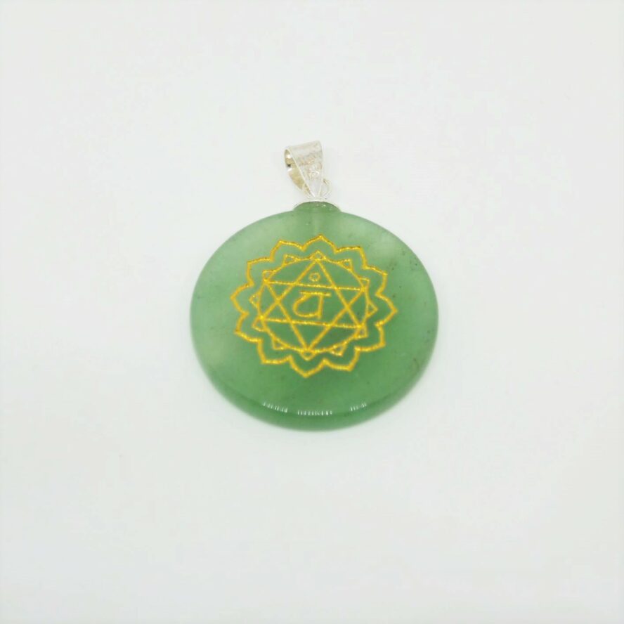 Pendentif disque d’aventurine avec le symbole du chakra du cœur ( 2.4 cm de diamètre sur 0.3 cm d’épaisseur)