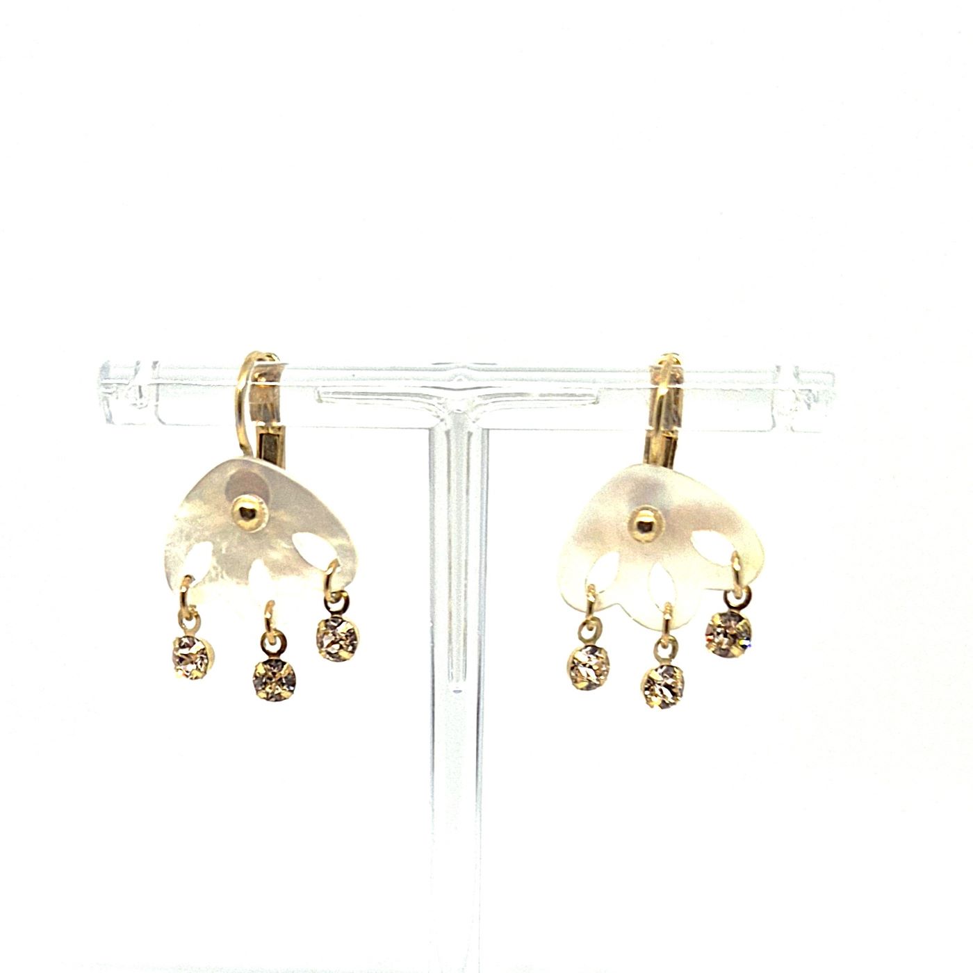 Dormeuses en laiton doré, mettant en évidence un pendentif en nacre travaillé comme de la dentelle. La présence de cristal et des pointes dorées, renforce le travaille de dentelle. Boucles légères et lumineuses