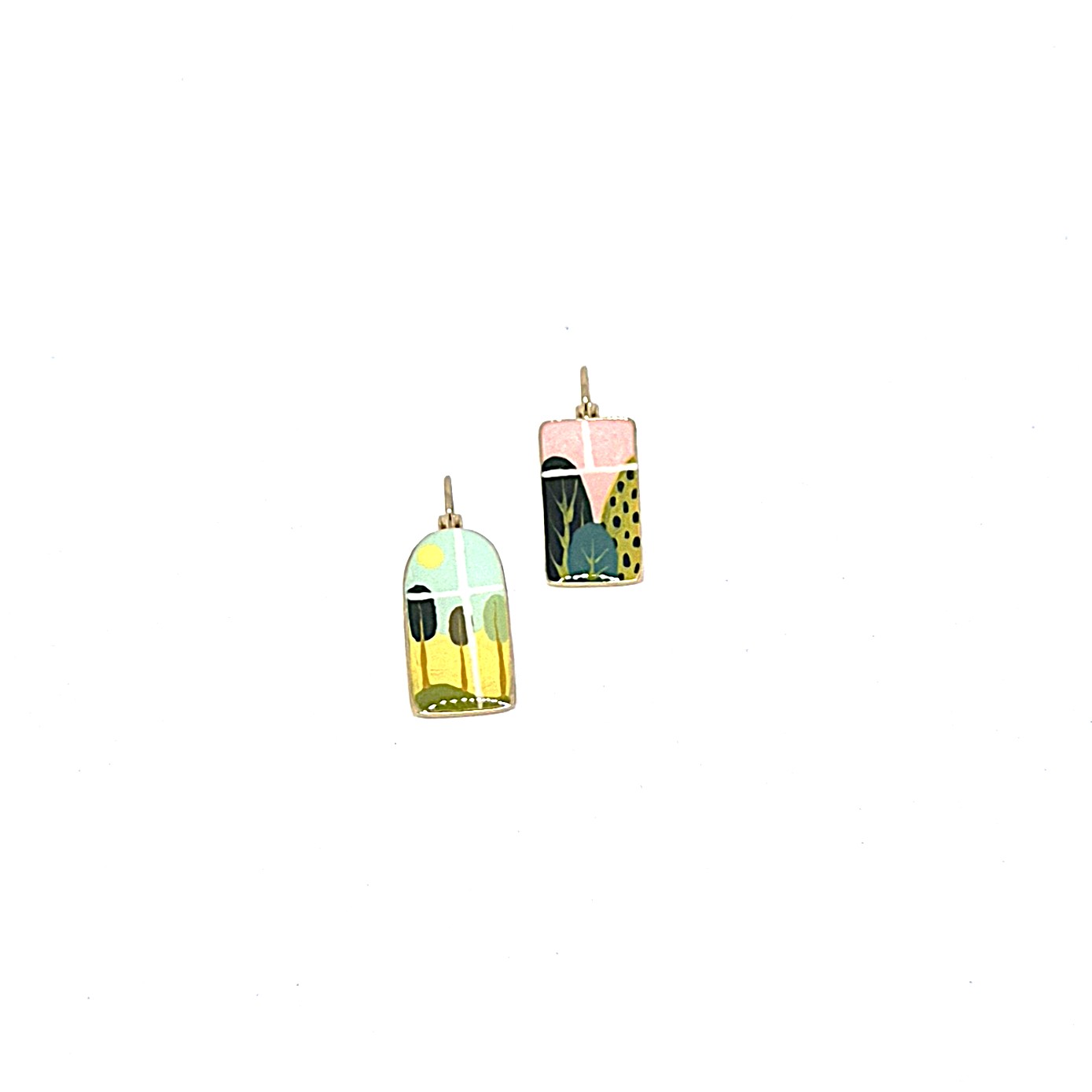 Dormeuses dépareillées en laiton doré représentant des moments de vie a travers des fenêtres. Les détails sont peints à la main dans des teintes douces. Boucles  légères.