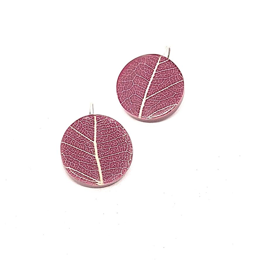 Dormeuses composées d’un disque avec une feuille prise sous résine colorée dans les tons de prunes.