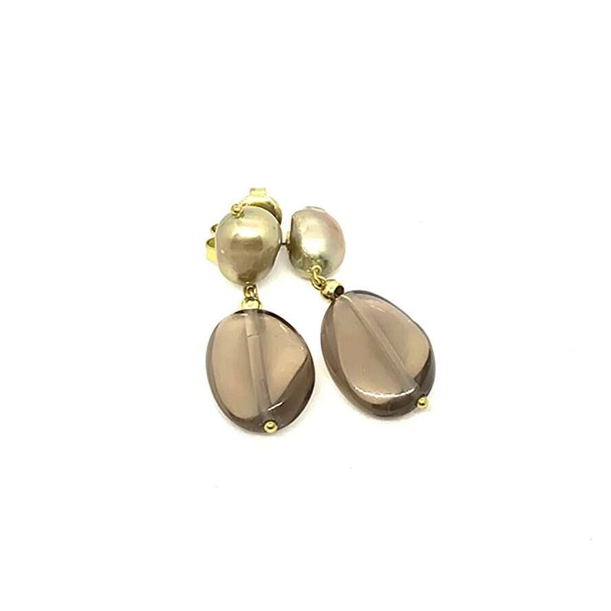 Boucles à tiges droites avec une perle d’eau douce sur le lobe, suivie par une goutte de quartz fumé. Boucle aux couleurs douces et lumineuses.