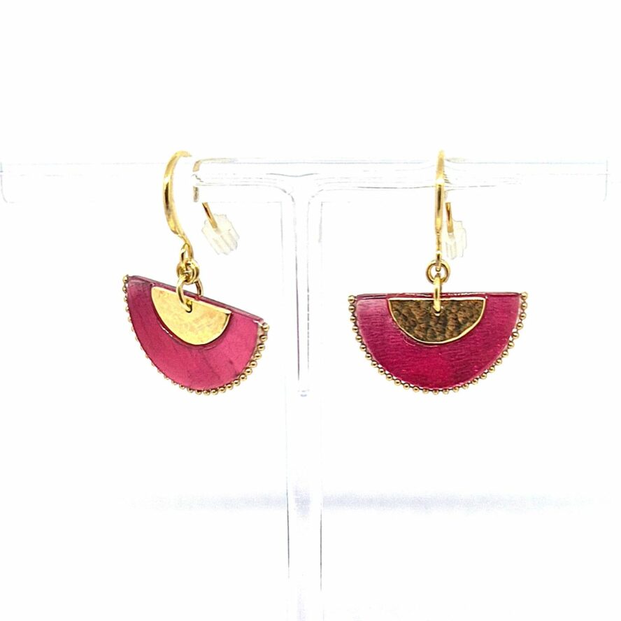 Boucles crochets dorées à l’or fin, le demi cercle est en nacre recouvert de résine rouge, il est mis en évidence part la partie martelée du dessus, et part la chaine petites billes qui le souligne. Boucles légères et lumineuses.