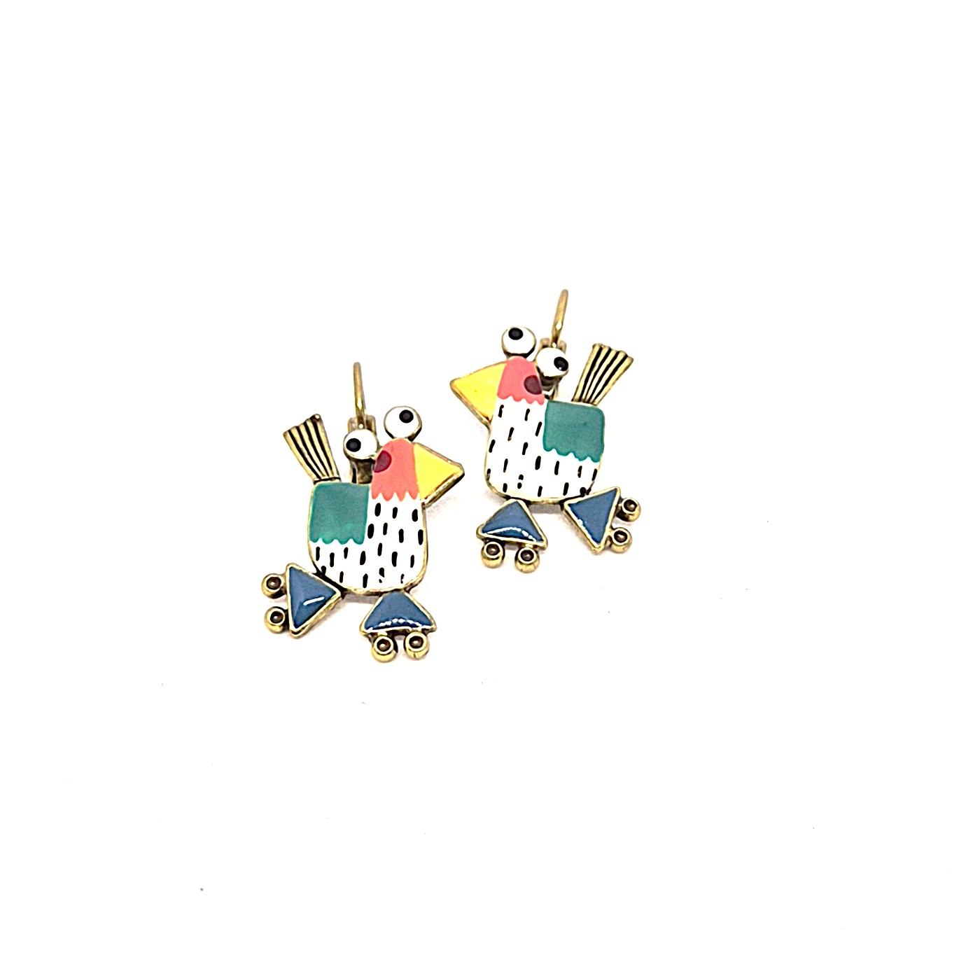 Dormeuses en bronze représentant des cocotes à roulettes, elles sont peintes à la main dans les couleurs vives.