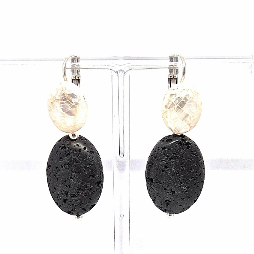 Dormeuses en bronze argenté avec une navette de mosaïque de nacre au niveau du lobe, suivie par une perle de pierre de lave. Boucle mobile moderne et chic.